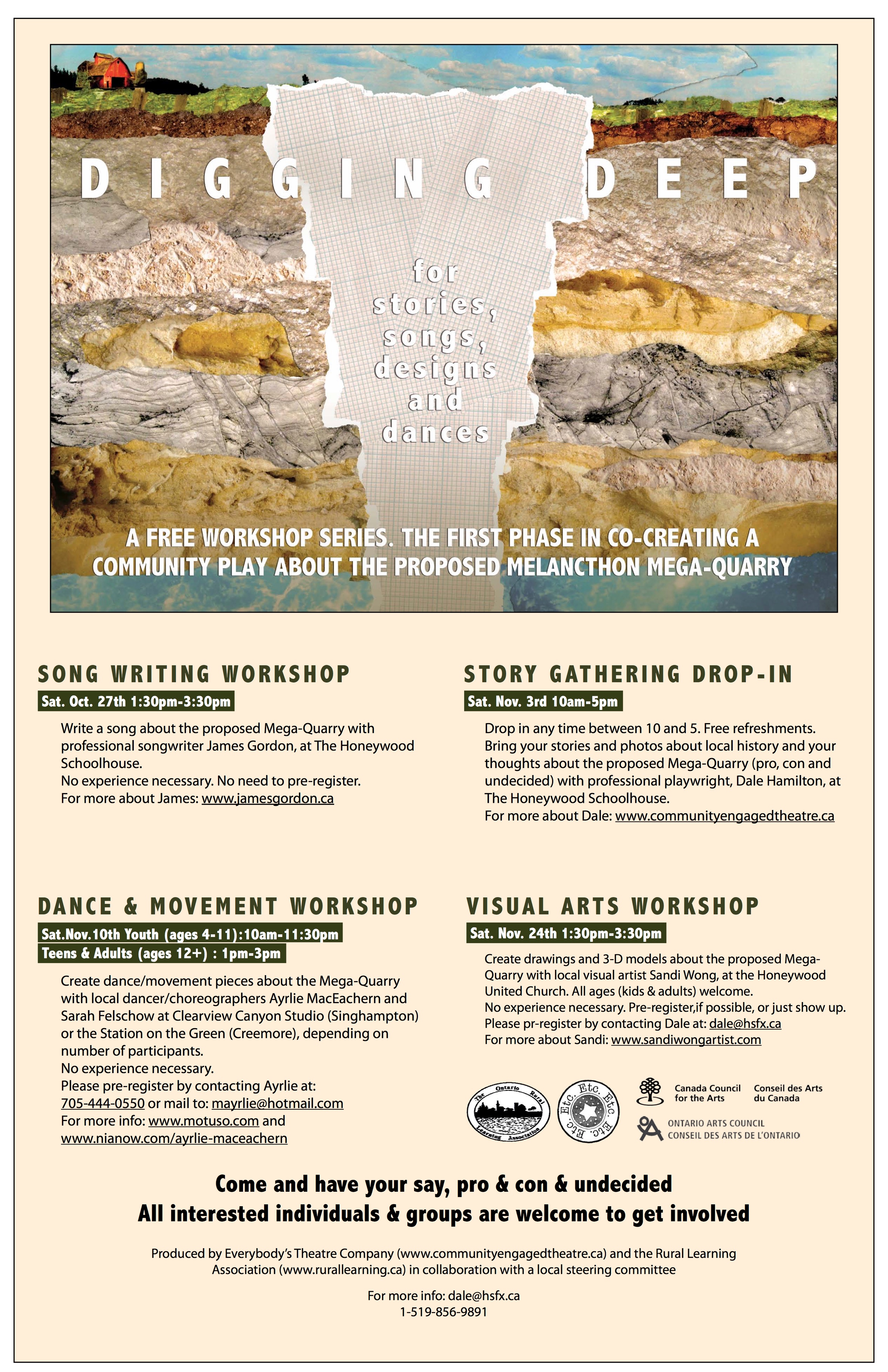 The Research and Development phase of “Digging Deeper: The Highland Mega-Quarry Community Play” was completed by Dale in 2012, in collaboration with residents affected by a proposal from an American hedge fund to develop the biggest quarry in North America on prime agricultural land. Plans were being made to begin the production phase when the mega-quarry project was abandoned by the hedge fund due to the intensity of the protests, of which the community play project was one component.